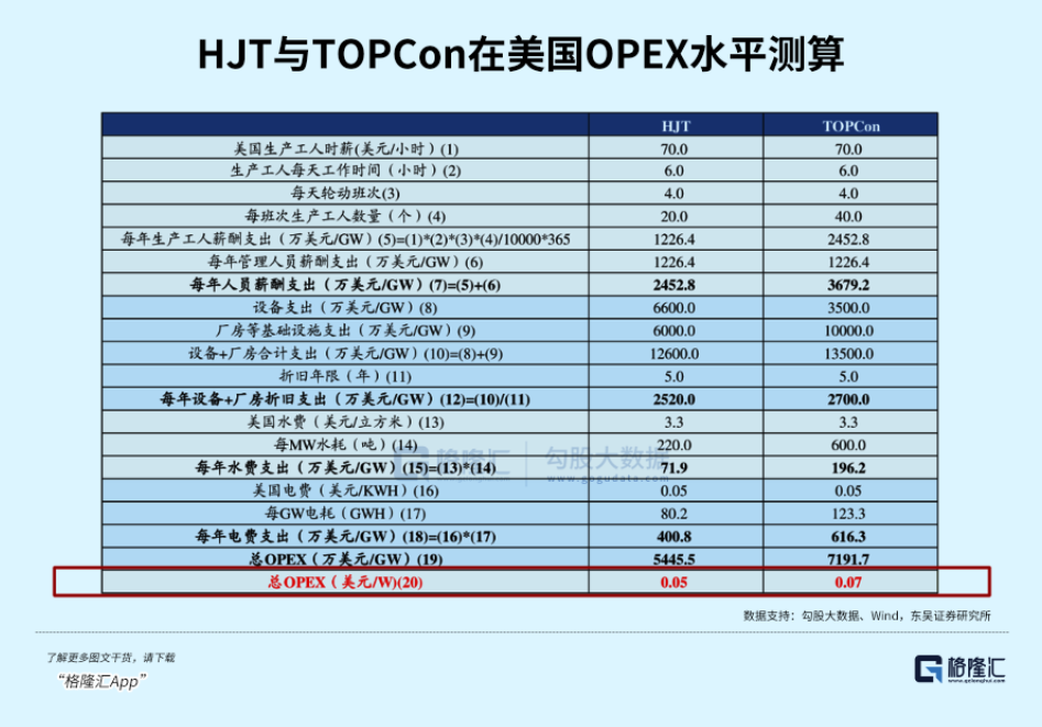 從工序復(fù)雜度來看,HJT僅需4道核心工序(清洗制絨、非晶硅沉積、TCO膜沉積、絲網(wǎng)印刷),而TOPCon需要十幾道工序,并且疊加各項成本后,HJT每吉瓦運營成本(OPEX)僅為5400-5500萬美元,而TOPCon高達(dá)7200萬美元,每瓦運營成本差距達(dá)2美分(約合人民幣0.1元)。