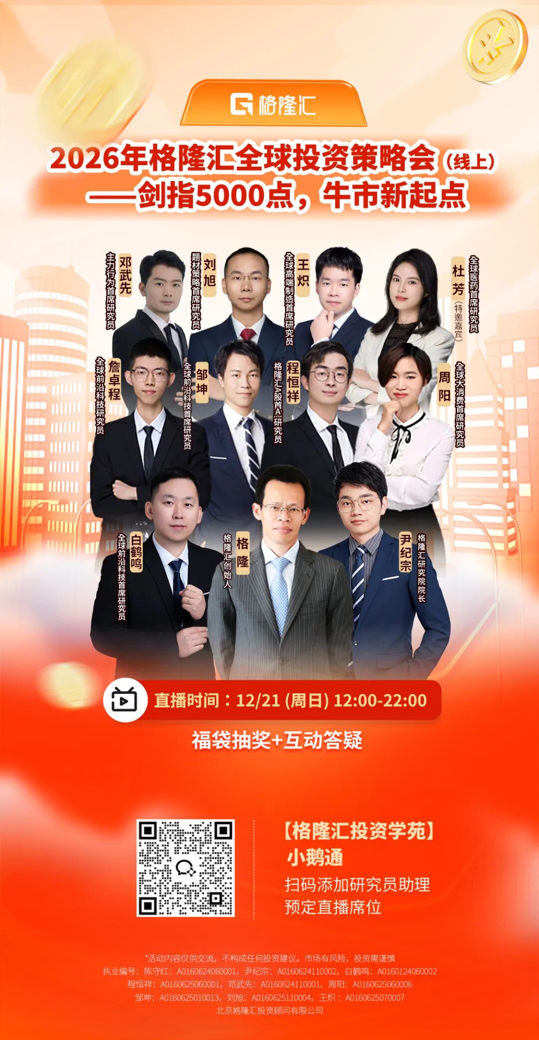 相約2025年12月21日(本周日),格隆博士將親自帶領(lǐng)格隆匯研究院各位首席研究員,通過線上方式重磅開啟“2026年格隆匯全球投資策略會——劍指5000點,牛市新起點”。