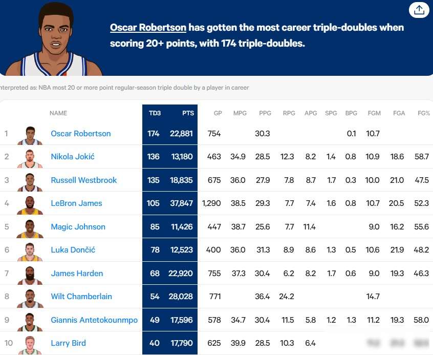在最近三個賽季里,這位球員每個賽季都能拿到超過20次三雙,今年他只打了307場比賽,就已經接近威斯布魯克保持的181次三雙紀錄,按照這個速度發展下去,到明年常規賽結束之前,他很可能超越羅伯特森創下的174次三雙記錄,到時候他將成為唯一一個在現代高強度防守、復雜戰術安排和輪休管理背景下,依然能頻繁拿到三雙的中鋒,這種情況本身就說明了很多事情。
