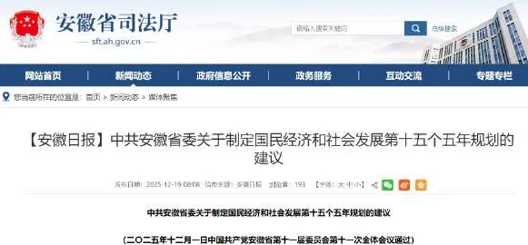 12月19日,中共安徽省委關(guān)于制定國民經(jīng)濟和社會發(fā)展第十五個五年規(guī)劃的建議發(fā)布。