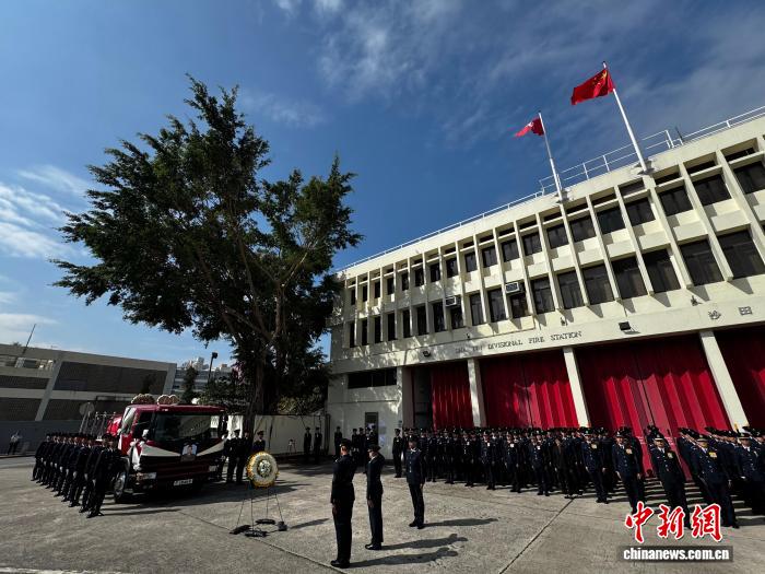 圖為載著何偉豪靈柩的消防車抵達其生前所屬的沙田消防局,消防人員列隊敬禮。 中新社記者 李志華 攝