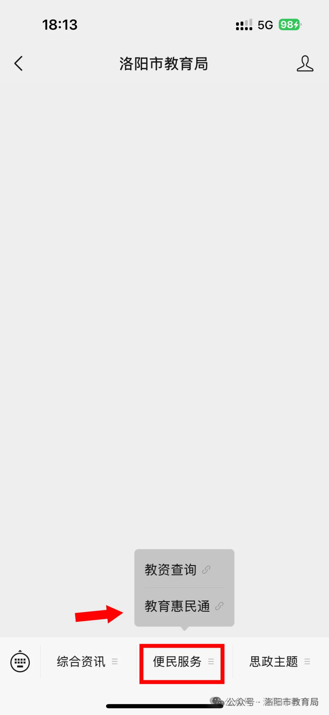 ②點擊“洛陽市教育局”微信下方“便民服務”,進入便民功能頁面。