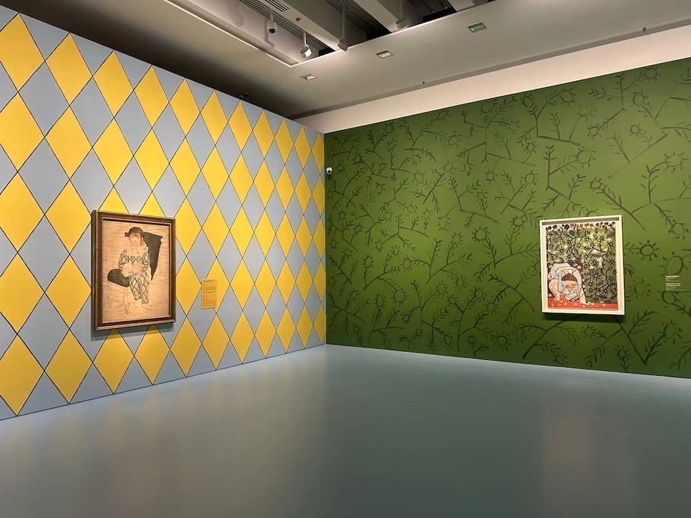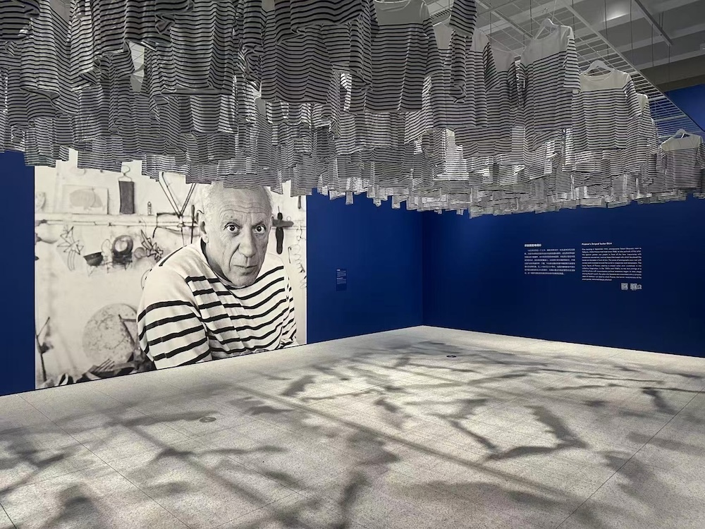 不同于美術館的白盒子空間,“非常畢加索:保羅·史密斯的新視角”(下簡稱“非常畢加索”)呈現的是一個個色彩斑斕的空間。從藍色時期的憂郁、到玫瑰時期的陽光燦爛、再到立體主義、拼貼時代……每一個時期,化為展墻的不同色彩與肌理,也化作不同質地地面的不同質感,甚至是懸于展廳上方的條紋海魂衫——鮮明的色彩、富有趣味的方式,以及對材質與圖案的游戲性運用,讓觀眾與畢加索之間變得親近。