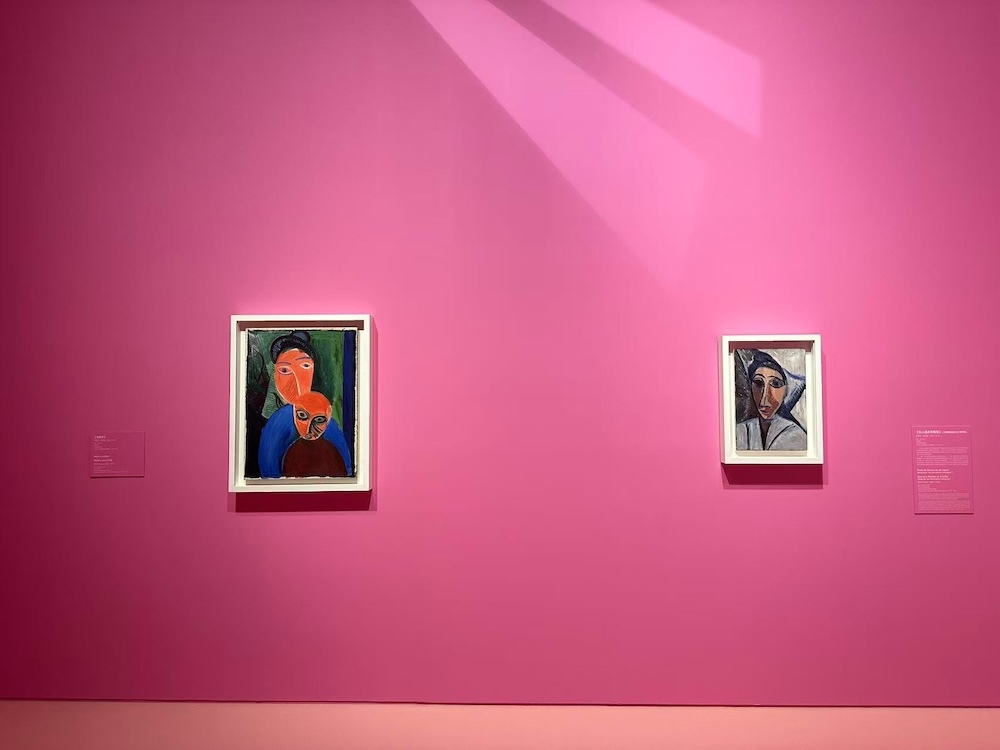 展覽現場,“粉紅女子:《阿維尼翁的少女》之序幕”板塊,右為《女人或水手胸像》(《阿維尼翁的少女》研習稿),展墻上還模擬了阿維尼翁的陽光。