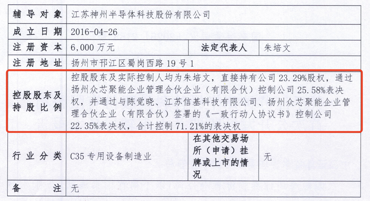 股權方面,神州半導體的控股股東及實際控制人均為朱培文,直接持有公司23.29%股權,通過揚州眾芯聚能企業管理合伙企業(有限合伙)控制公司25.58%表決權,并通過與陳覺曉、江蘇信基科技有限公司、揚州眾芯聚能企業管理合伙企業(有限合伙)簽署的《一致行動人協議書》控制公司22.35%表決權,合計控制71.21%的表決權。