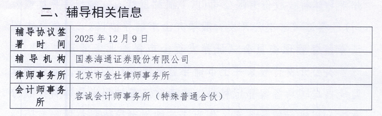 本次IPO的輔導機構為國泰海通證券股份有限公司,律師事務所為北京市金杜律師事務所,會計師事務所為容誠會計師事務所(特殊普通合伙)。