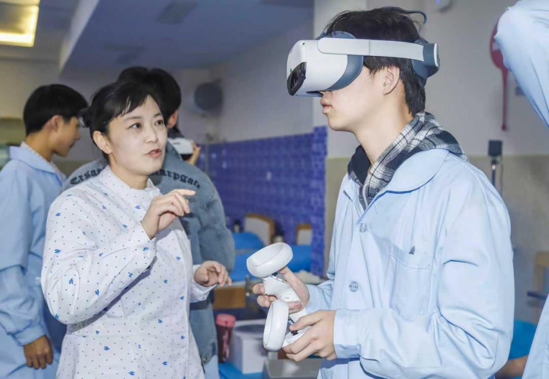 洛陽職業(yè)技術(shù)學(xué)院智慧康養(yǎng)實(shí)訓(xùn)中心老師通過VR講解如何進(jìn)行護(hù)理實(shí)操訓(xùn)練