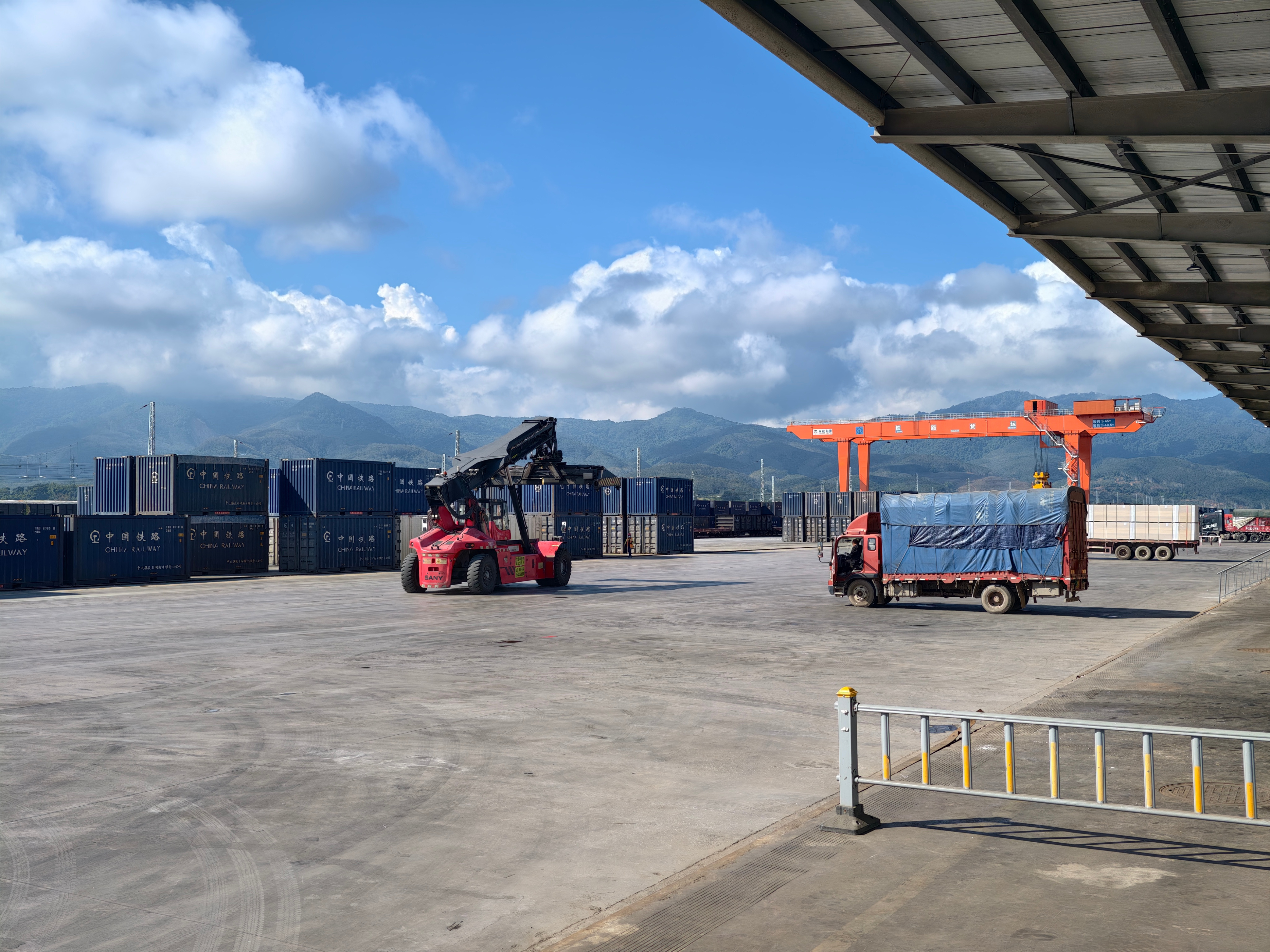 清晨的野象谷貨場,龍門吊正在來來回回吊裝集裝箱,叉車絡(luò)繹不絕地穿梭在各個(gè)倉庫間,一派繁忙景象。我被允許站在貨場高處眺望,只見一排排集裝箱整齊堆放,里面裝滿了西雙版納的橡膠、白糖、水果等特產(chǎn),即將搭乘鐵路班列發(fā)往全國各地。