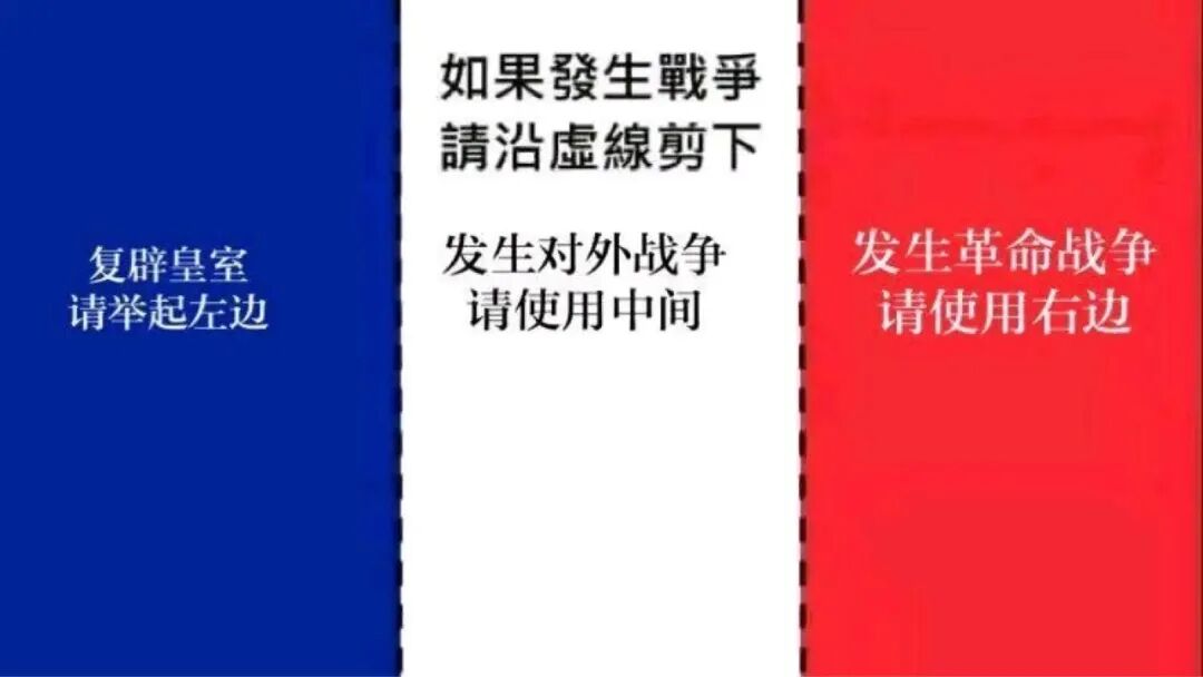 “法國的國旗為什么是藍白紅三色的?保皇的時候用左邊,革命的時候舉右邊,打仗的時候……把兩邊剪掉就可以了。”