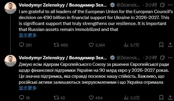 同日,烏克蘭總統澤連斯基發文感謝歐盟提供的900億歐元貸款。