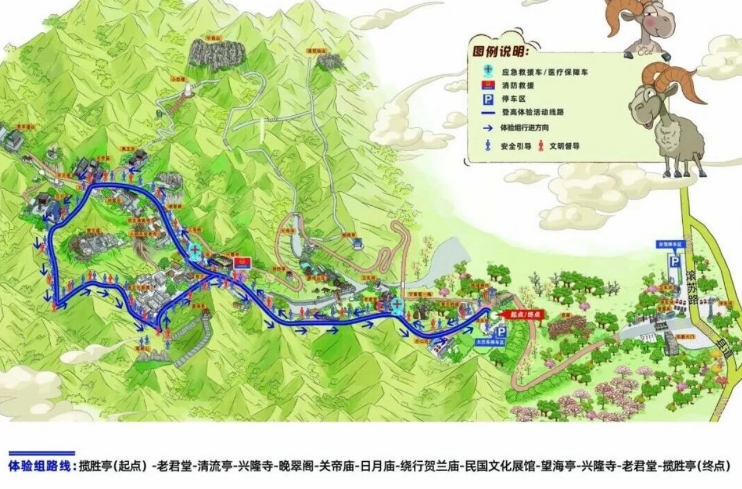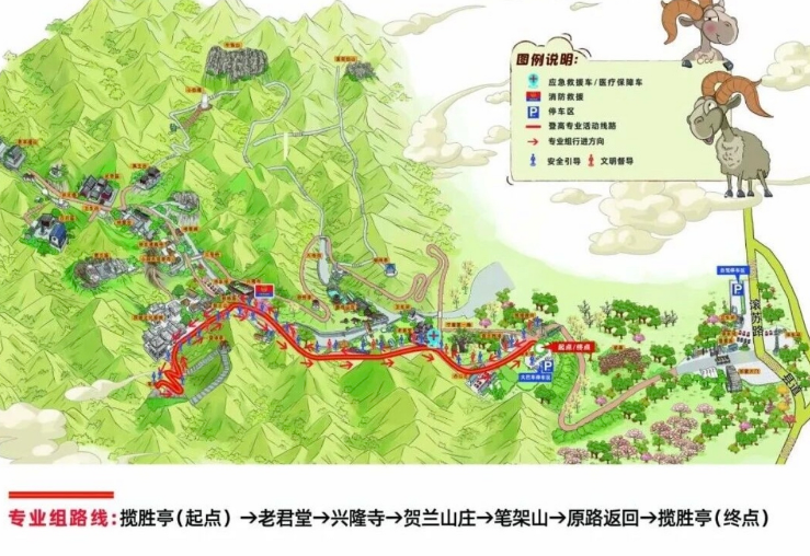 本次活動,體驗組路線3.5公里:攬勝亭(起點)-老君堂-清流亭-興隆寺-晚翠閣-關帝廟-日月廟-繞行賀蘭廟-民國文化展館-望海亭-興隆寺-老君堂-攬勝亭(終點);專業組路線6.4公里:攬勝亭(起點)→老君堂→興隆寺→賀蘭山莊→筆架山→原路返回→攬勝亭(終點),參與活動可領取登山紀念獎牌和活動禮包。