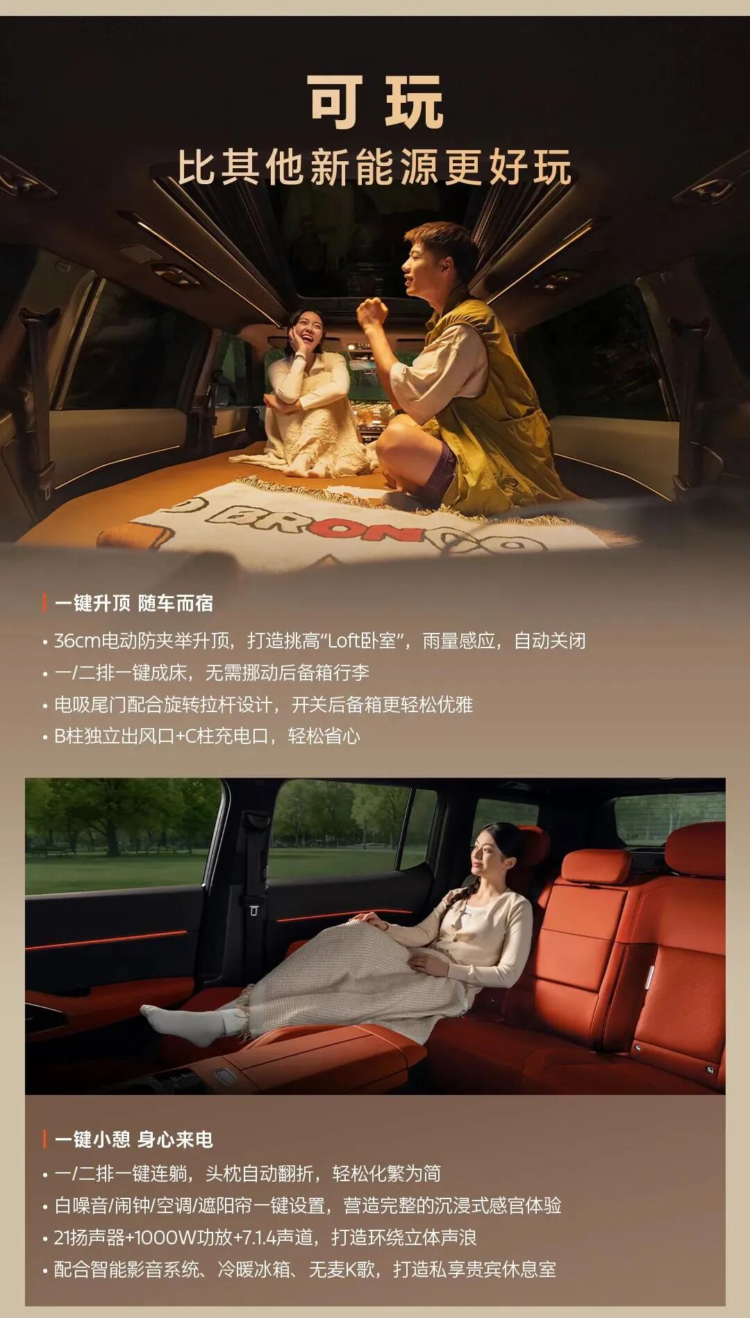 三電方面,純電版車型全系標配電四驅系統,最大功率332kW,匹配105.4kWh磷酸鐵鋰電池,CLTC純電續航650km,零百加速5.3s。增程版搭載110kW 1.5T增程器+310kW雙電機,匹配43.7kWh磷酸鐵鋰電池,CLTC純電續航220km。