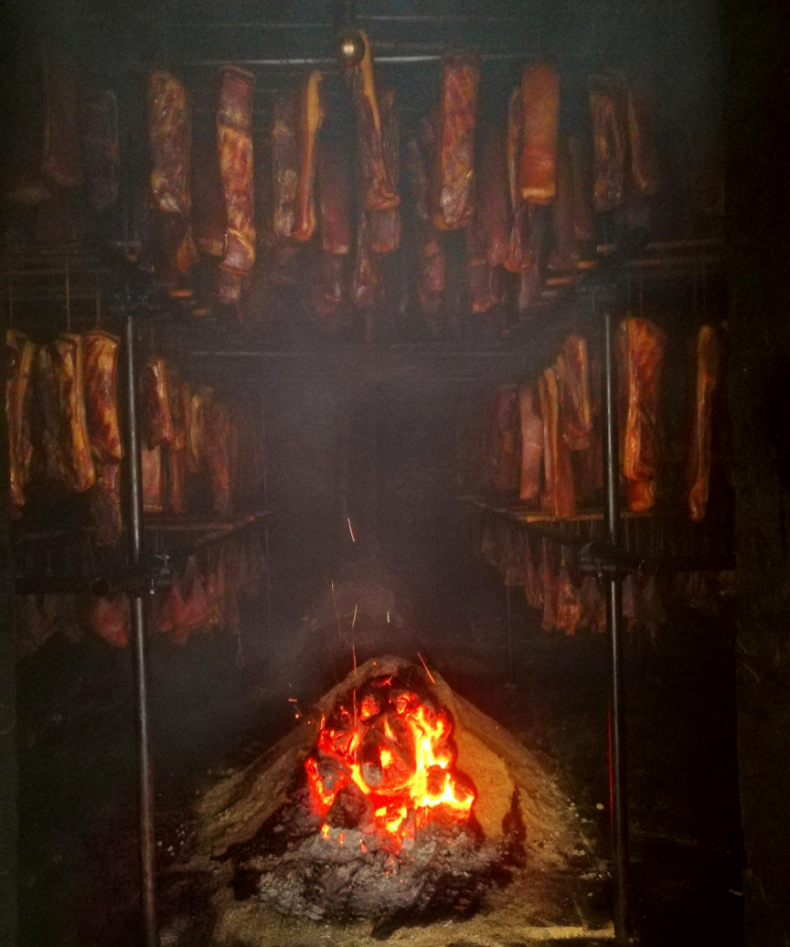 熏制時,將晾曬后的肉品懸掛于特制熏房高處,下方架起柴火,控制小火慢熏。