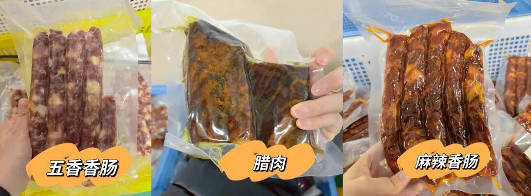 麻辣香腸、五香香腸、限定款冰糖陳皮香腸、五花臘肉、后腿臘肉多種口味可選。
