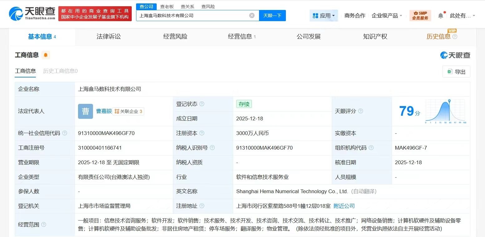 天眼查App顯示,近日,上海盒馬數(shù)科技術(shù)有限公司成立,法定代表人為曹嘉銀,注冊資本3000萬人民幣,經(jīng)營范圍含信息技術(shù)咨詢服務(wù)、軟件開發(fā)、軟件銷售、網(wǎng)絡(luò)設(shè)備銷售、計算機(jī)軟硬件及輔助設(shè)備零售、計算機(jī)軟硬件及輔助設(shè)備批發(fā)、非居住房地產(chǎn)租賃等,由盒馬(中國)有限公司全資持股。