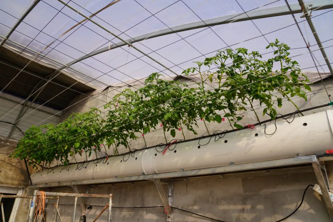同日,在同樣位于雨金街道照渠村的西安市番茄研究所里,各種現代化設施大棚林立。溫室大棚內一株株番茄秧苗拔節生長,有的早熟品種已經開花掛果。在大棚四周和空中布置的有機生態型無土栽培種植槽上,茂密的番茄藤蔓沿著牽引線一直向上攀爬,直沖房頂,底部掛滿了一串串綠色的番茄。