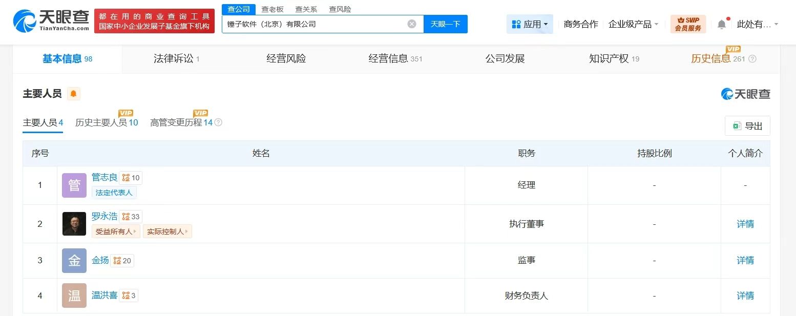 天眼查App顯示,近日,錘子軟件(北京)有限公司上海分公司成立,負(fù)責(zé)人為管志良,經(jīng)營(yíng)范圍含貨物進(jìn)出口、技術(shù)進(jìn)出口、計(jì)算機(jī)軟硬件及輔助設(shè)備批發(fā)、通信設(shè)備銷售、通用設(shè)備修理、風(fēng)力發(fā)電技術(shù)服務(wù)、人工智能應(yīng)用軟件開發(fā)、軟件銷售、人工智能雙創(chuàng)服務(wù)平臺(tái)、信息咨詢服務(wù)等,總公司為錘子軟件(北京)有限公司,后者執(zhí)行董事為羅永浩。