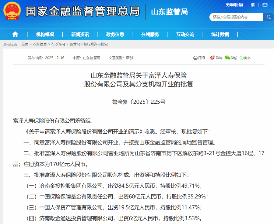 就在12月16日,國家金融監督管理總局山東監管局批復,同意富澤人壽保險股份有限公司開業,并接受山東金融監管局的屬地監督管理。