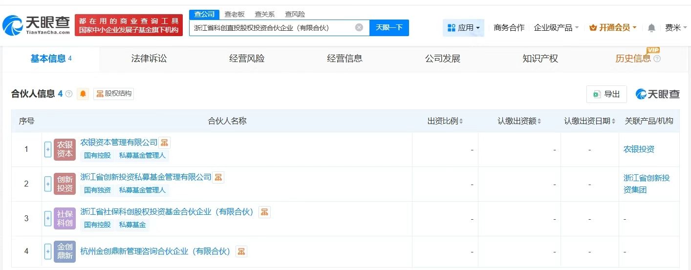 天眼查App顯示,近日,浙江省科創直投股權投資合伙企業(有限合伙)成立,執行事務合伙人為那力嘉、邵玨,出資額約80.8億人民幣,經營范圍為以私募基金從事股權投資、投資管理、資產管理等活動,股權投資,創業投資,由農銀資本管理有限公司、浙江省創新投資私募基金管理有限公司、浙江省社保科創股權投資基金合伙企業(有限合伙)、杭州金創鼎新管理咨詢合伙企業(有限合伙)共同出資。