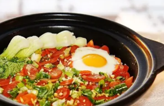 待雞蛋凝固,再碼入油菜,蓋上鍋蓋繼續小火燜2分鐘關火,燜5~10分鐘,蔥蒜末中撒點胡椒粉和鹽,攪拌均勻撒在烤腸上邊,澆2勺生抽,拌一拌就可以開餐了。