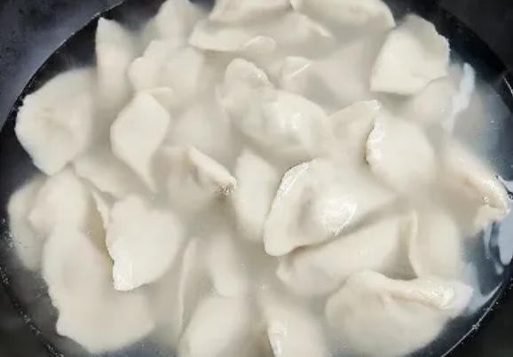 煮餃子:鍋中水開下入餃子,煮開澆冷水,再煮開再澆冷水,第三次翻開關火,出鍋裝盤。
