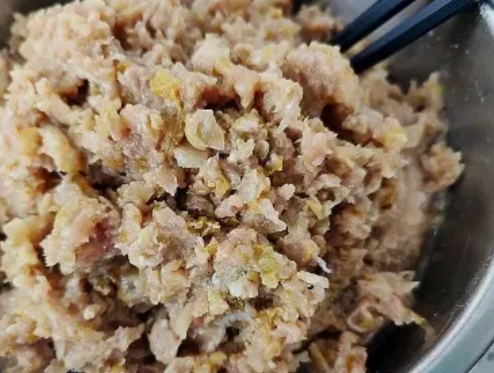 豬肉餡加入鹽攪拌均勻殺菌,加入蔥姜末、白糖、白胡椒粉、五香粉、生抽、蠔油沿一個方向充分攪拌均勻。分次加入老湯,繼續沿一個方向攪拌上勁,讓肉餡吸滿湯汁,最后炸熟豆油澆在肉餡上,攪拌上勁鎖住水分,酸菜洗凈剁碎,濾掉水分,加入到肉餡中攪拌均勻。