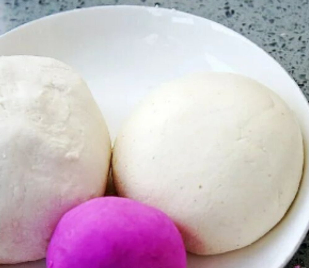 做法:水磨糯米粉加點鹽、糖,慢慢加入開水,稍涼揉成面團。同樣的方法用火龍果汁和開水燙面,和成面團。