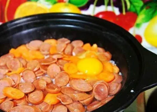米中臨上一勺橄欖油,攪拌均勻,大火燒開轉最小火燜煮10分鐘,待米飯的表面開始沒有米湯了,放入烤腸和胡蘿卜片,打入一個雞蛋,在鍋邊淋一勺橄欖油,讓鍋巴更香酥,蓋上鍋蓋,繼續小火慢慢燜。