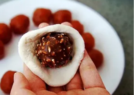 食材:水磨糯米粉、火龍果、砂糖橘、巧克力夾心糖、糖、鹽各適量。