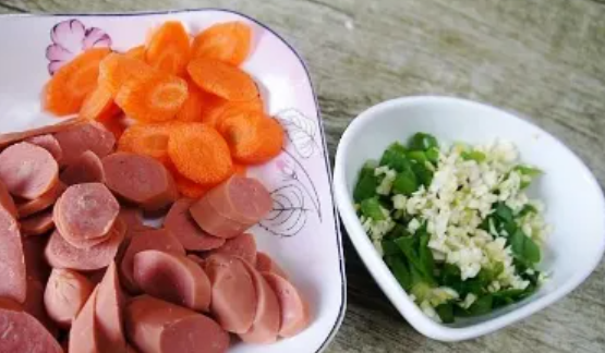 烤腸和胡蘿卜分別斜切片,小蔥、大蒜切末。