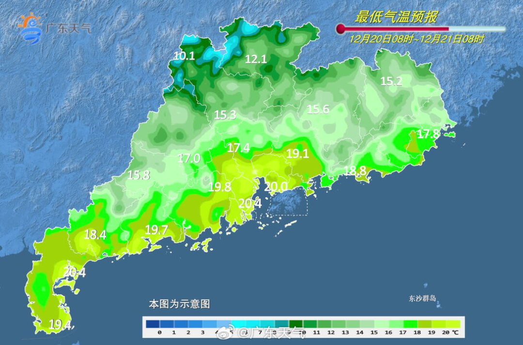 12月20日,廣東省大部多云間晴,局部有小雨。最低氣溫:粵北大部、肇慶、云浮11℃~15℃,其余市縣16℃~20℃。