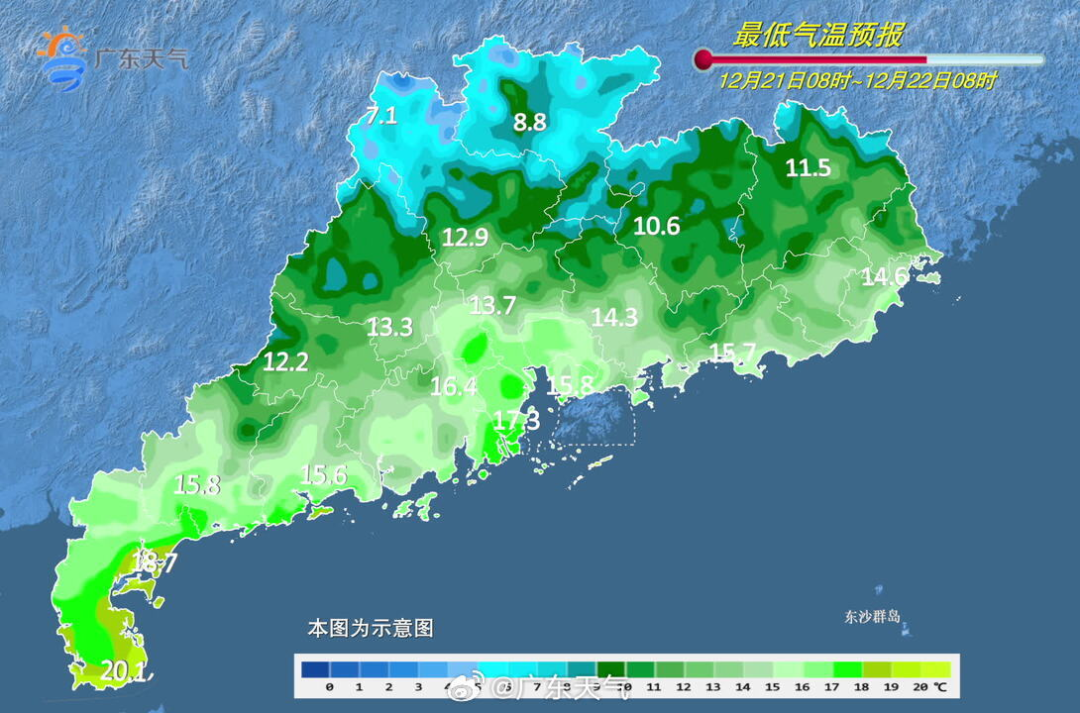 12月22日,廣東省南部市縣多云,局部有零星小雨,其余市縣多云間晴。最低氣溫:韶關、清遠北部、河源北部市縣7℃~11℃,珠三角中南部和南部沿海市縣17℃~20℃,其余市縣12~16℃。