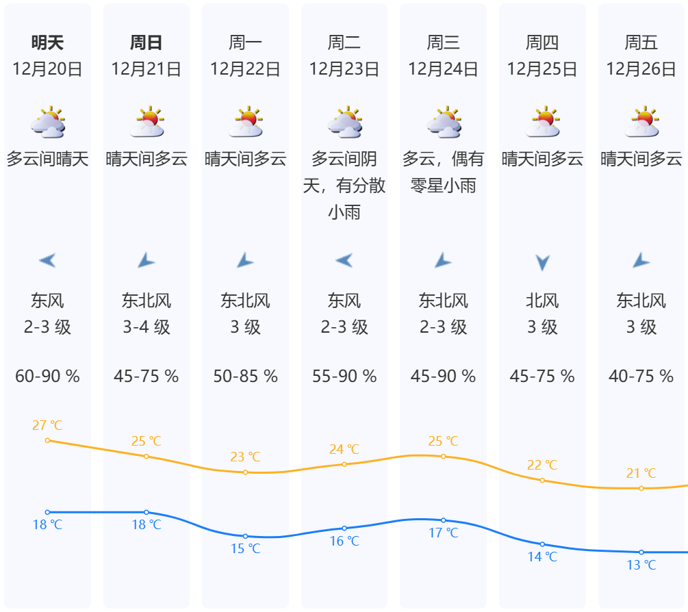 12月20日,晴天間多云,氣溫18℃~27℃。