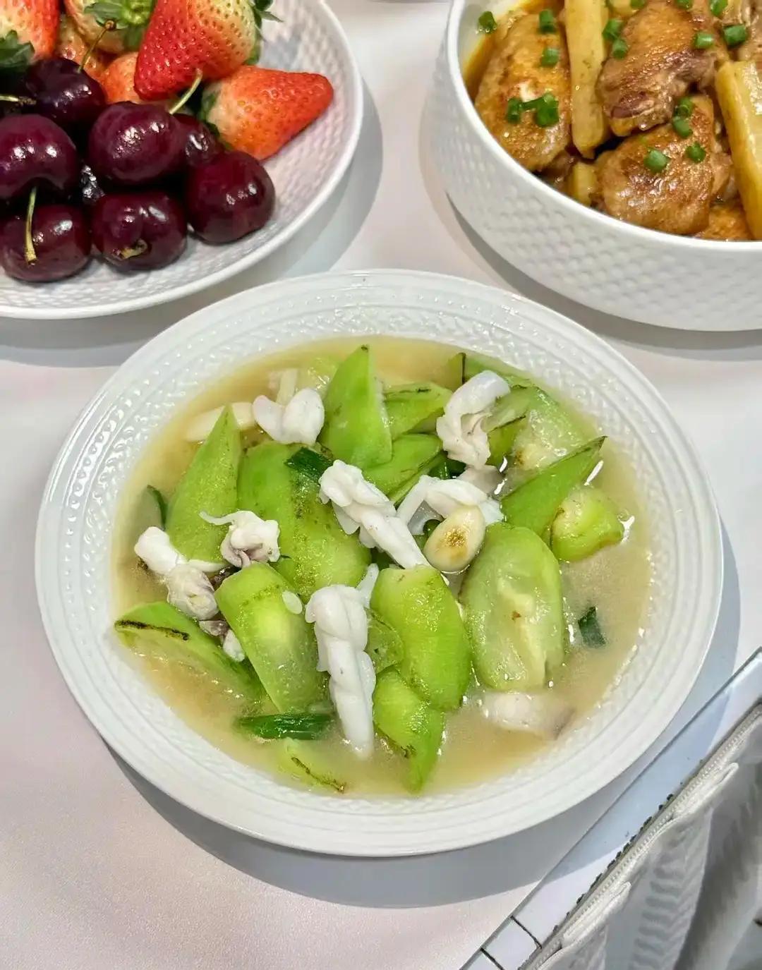 這道菜吃的就是脆嫩口感。絲瓜清甜,魷魚爽脆,搭配在一起,清爽又鮮美。