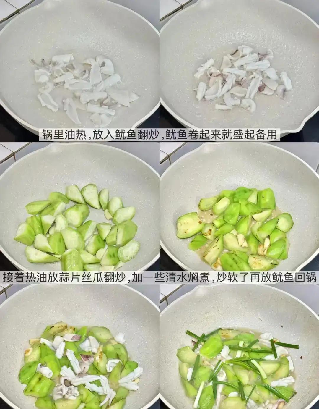 1. 預處理:鮮魷魚去皮,在內側打十字花刀,再切塊。水燒開,下魷魚焯燙10秒,卷成花立刻撈出過涼水,這樣才脆。絲瓜去皮切滾刀塊。