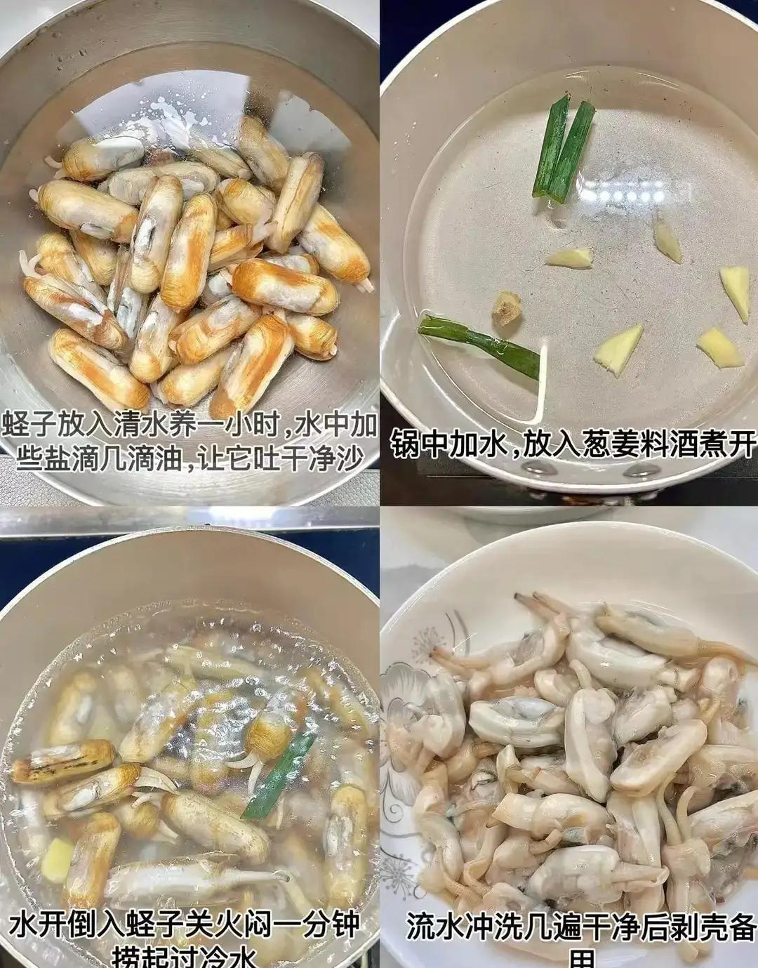 1. 吐沙是關鍵:買回來的蟶子用淡鹽水(水嘗起來有點咸就行)泡著,滴幾滴香油,靜置2小時,讓它們把沙吐干凈。下鍋前再搓洗幾遍外殼。