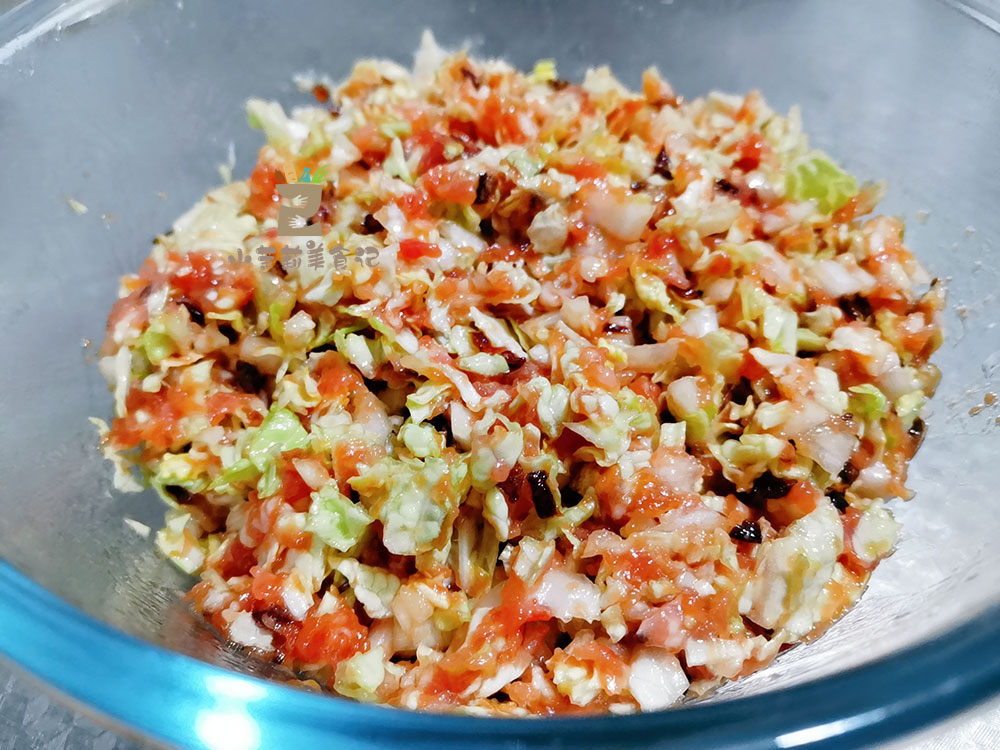3、白菜剝開(kāi),盡量用剁得方式將其處理成細(xì)碎的狀態(tài),其中撒點(diǎn)鹽,過(guò)十分鐘左右,包入紗布攥掉。