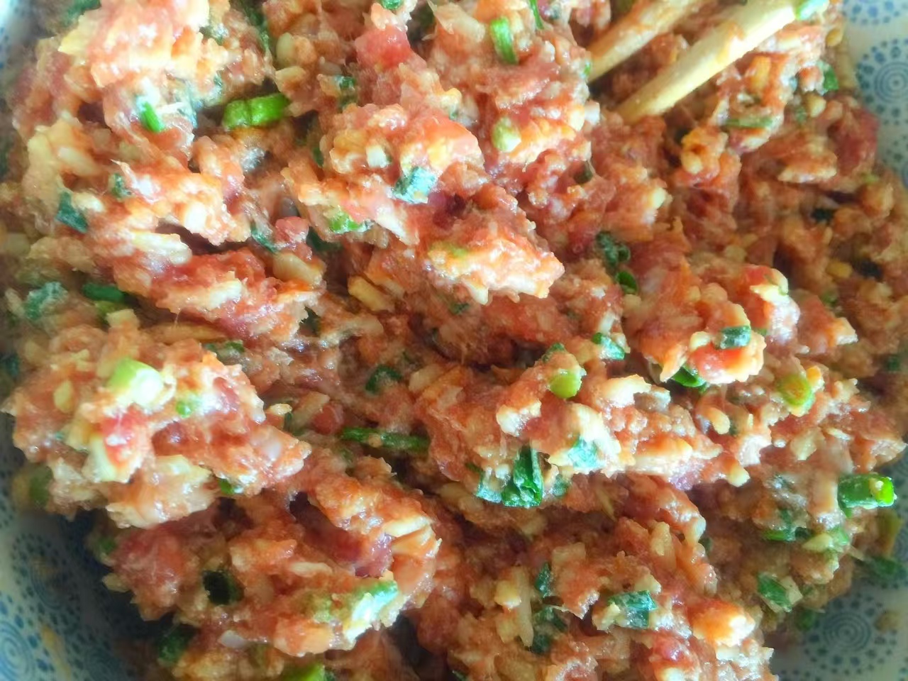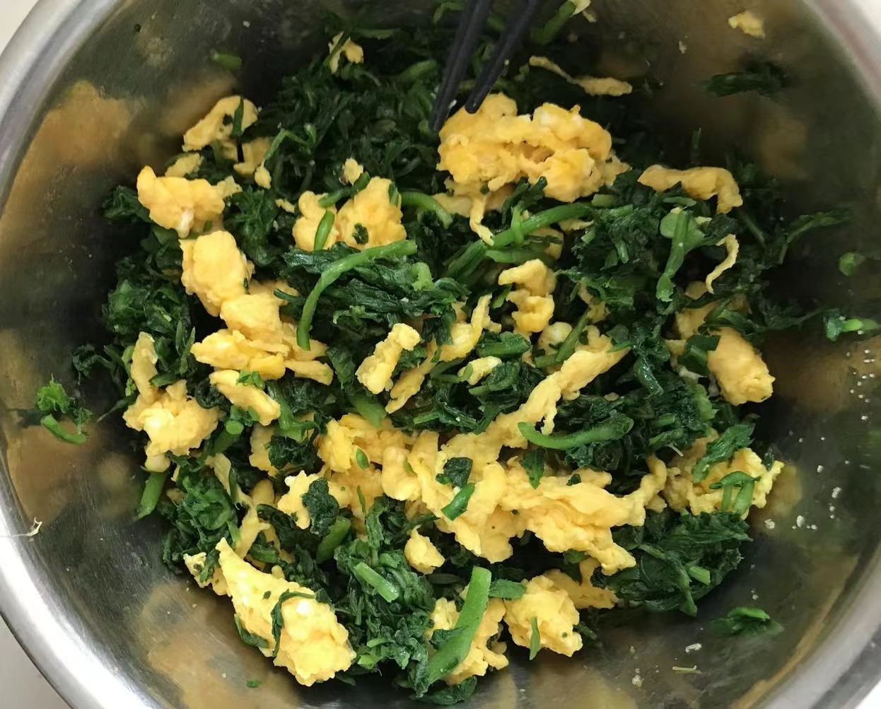 4、菜放進(jìn)肉中,快速把餡劃拉散,然后拌勻了,咸度調(diào)整到適宜,就可以包了。
