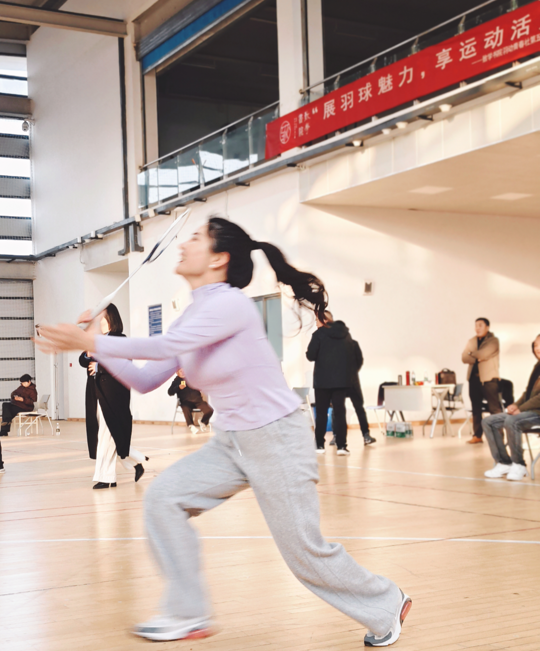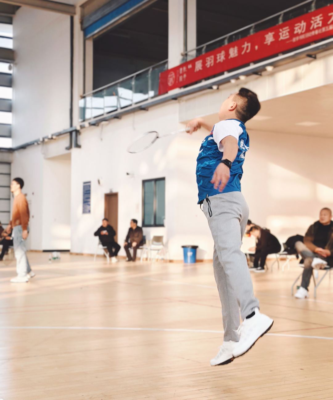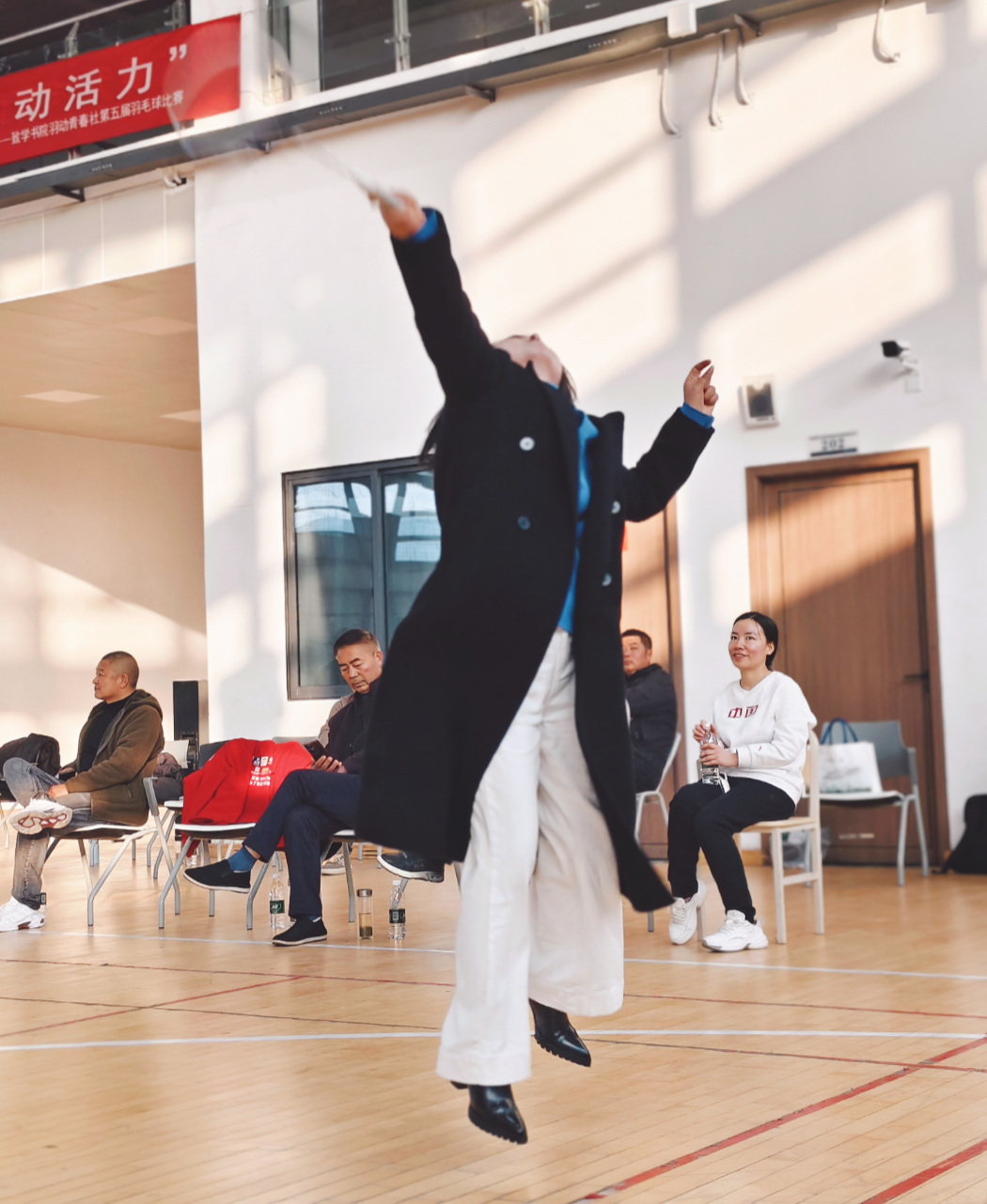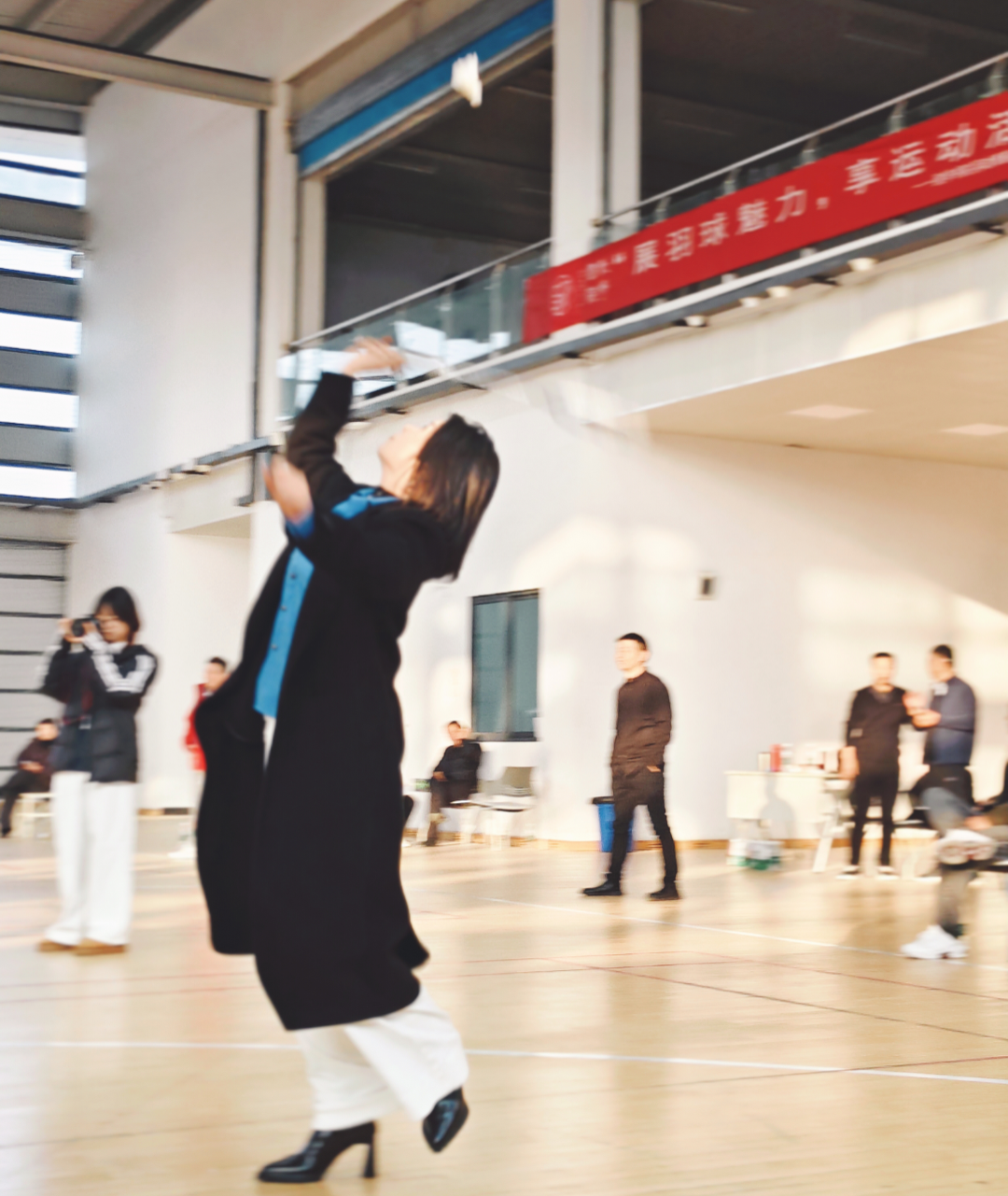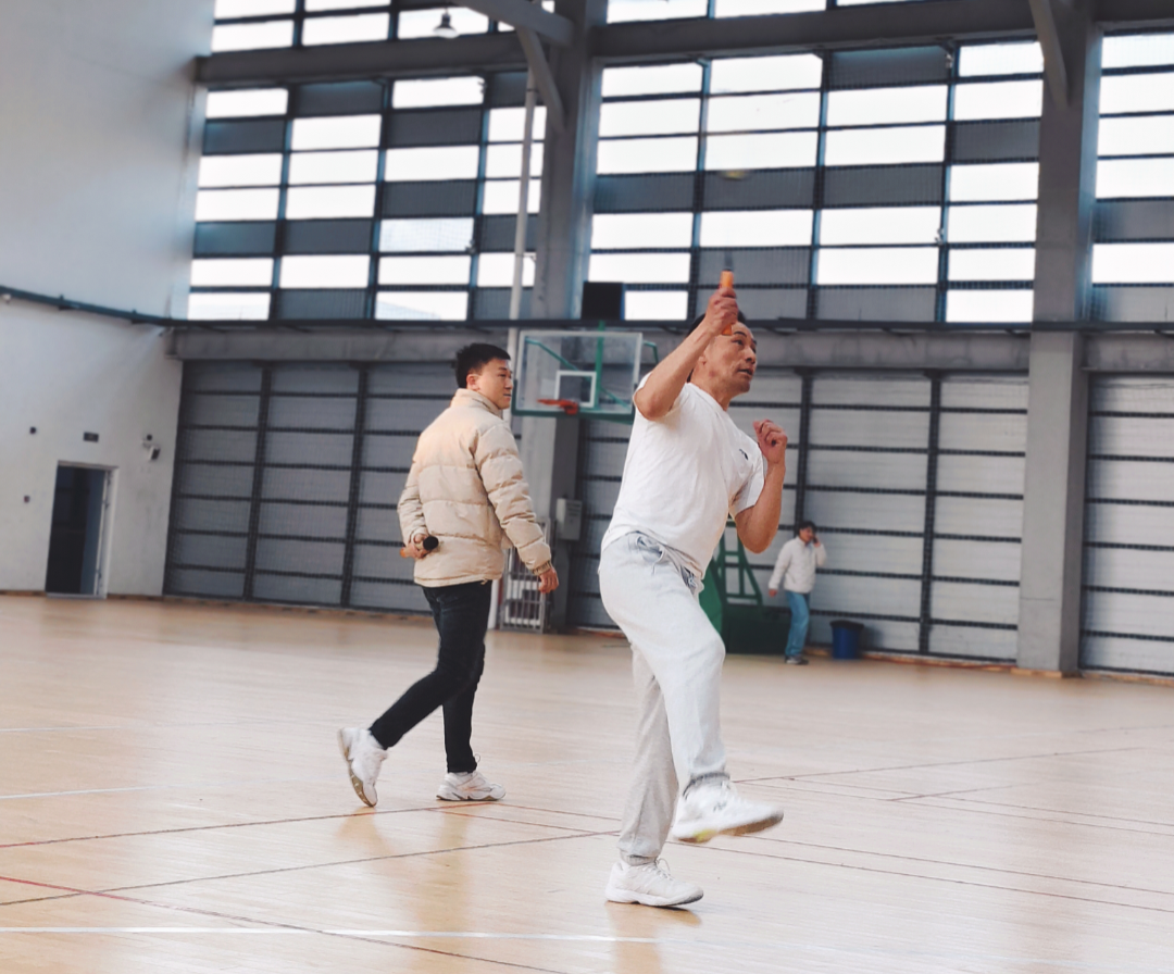 下午三點,室內羽毛球公開賽“鳴鑼開戰”。很快,男女混打,兩兩對訣,眨眼睛間進入比賽。雙方爭先恐后,勢均相當。