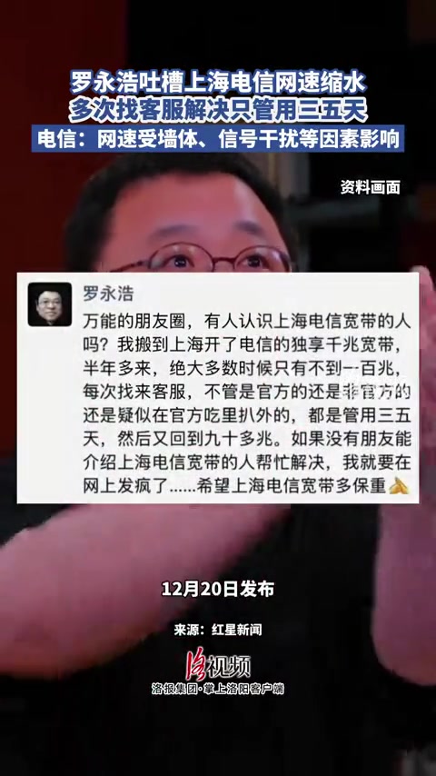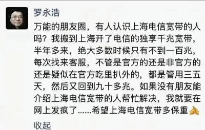 日前,知名博主羅永浩在朋友圈吐槽,稱自己搬到上海開了電信的獨享千兆寬帶半年多來,絕大多數時候只有不到一百兆的網速,每次找來客服,不管是官方的還是非官方的,都是管用三五天,然后又回到九十多兆。