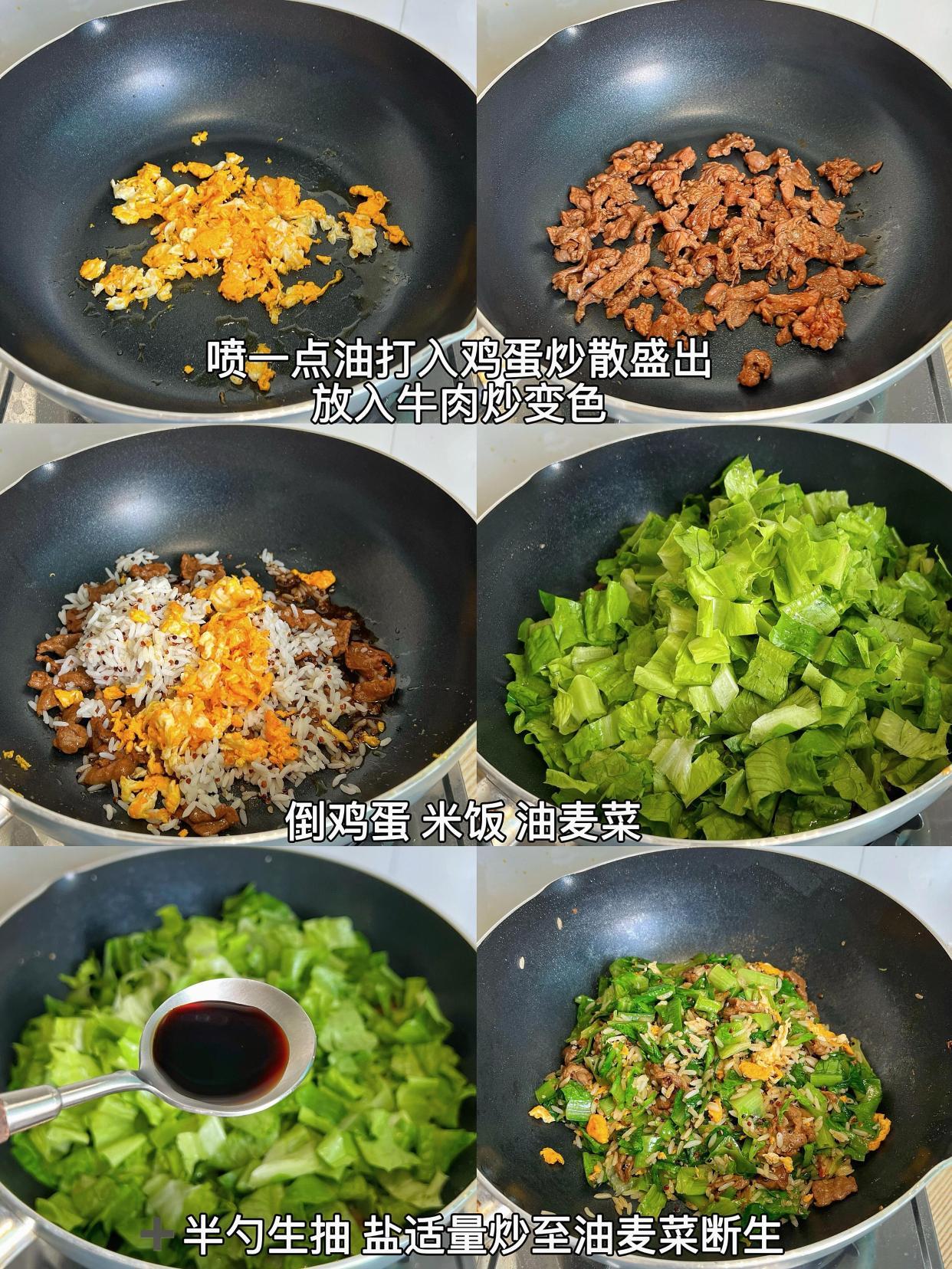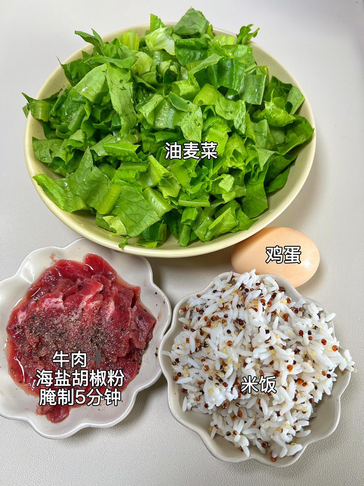 食材:油麥菜1把、雞蛋、牛肉、大米飯1碗、蒜末2瓣、生抽1勺、蠔油半勺、少許鹽
