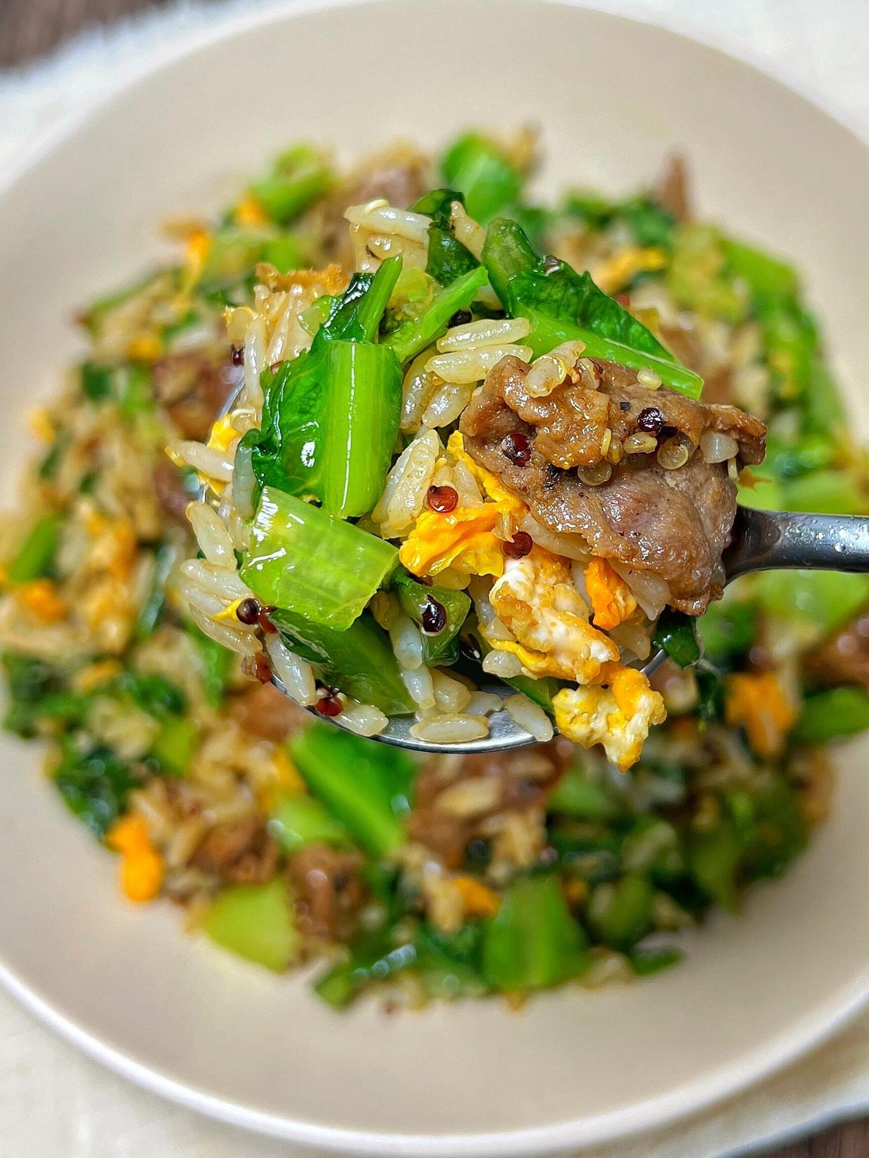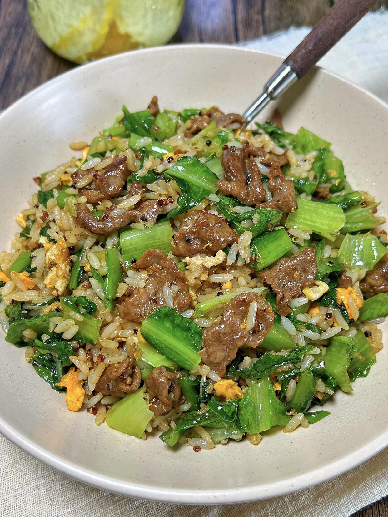 做法:油麥菜洗凈切段,熱鍋放少許油,倒入腌好的牛肉翻炒均勻,爆香蒜末,倒入油麥菜快速翻炒30秒至變軟,加生抽、蠔油和鹽調味,倒入炒好的雞蛋碎,翻炒均勻后淋在熱米飯上,拌勻就能吃。口感清爽,米飯吸滿菜香,下班回家懶得做飯,做這個省時又解膩,吃完腸胃無負擔,入睡更輕松。