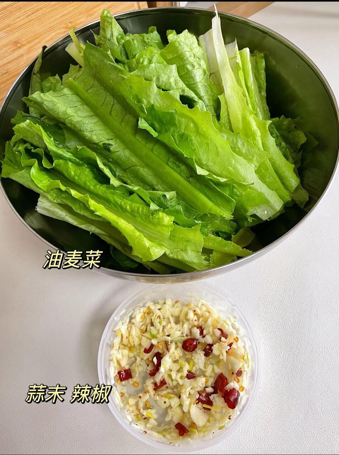 食材:油麥菜2把、蒜末3瓣、鹽少許、香油幾滴