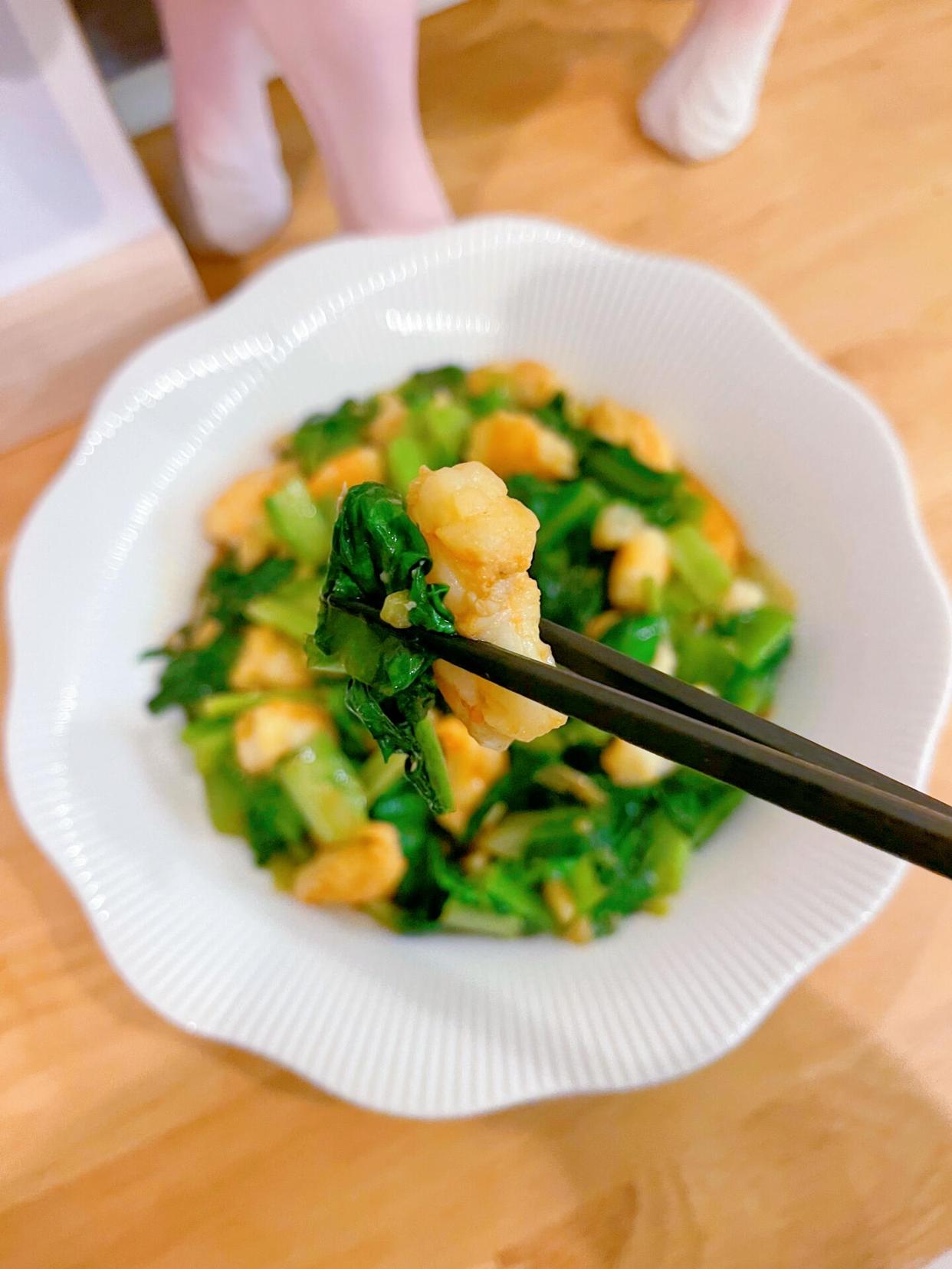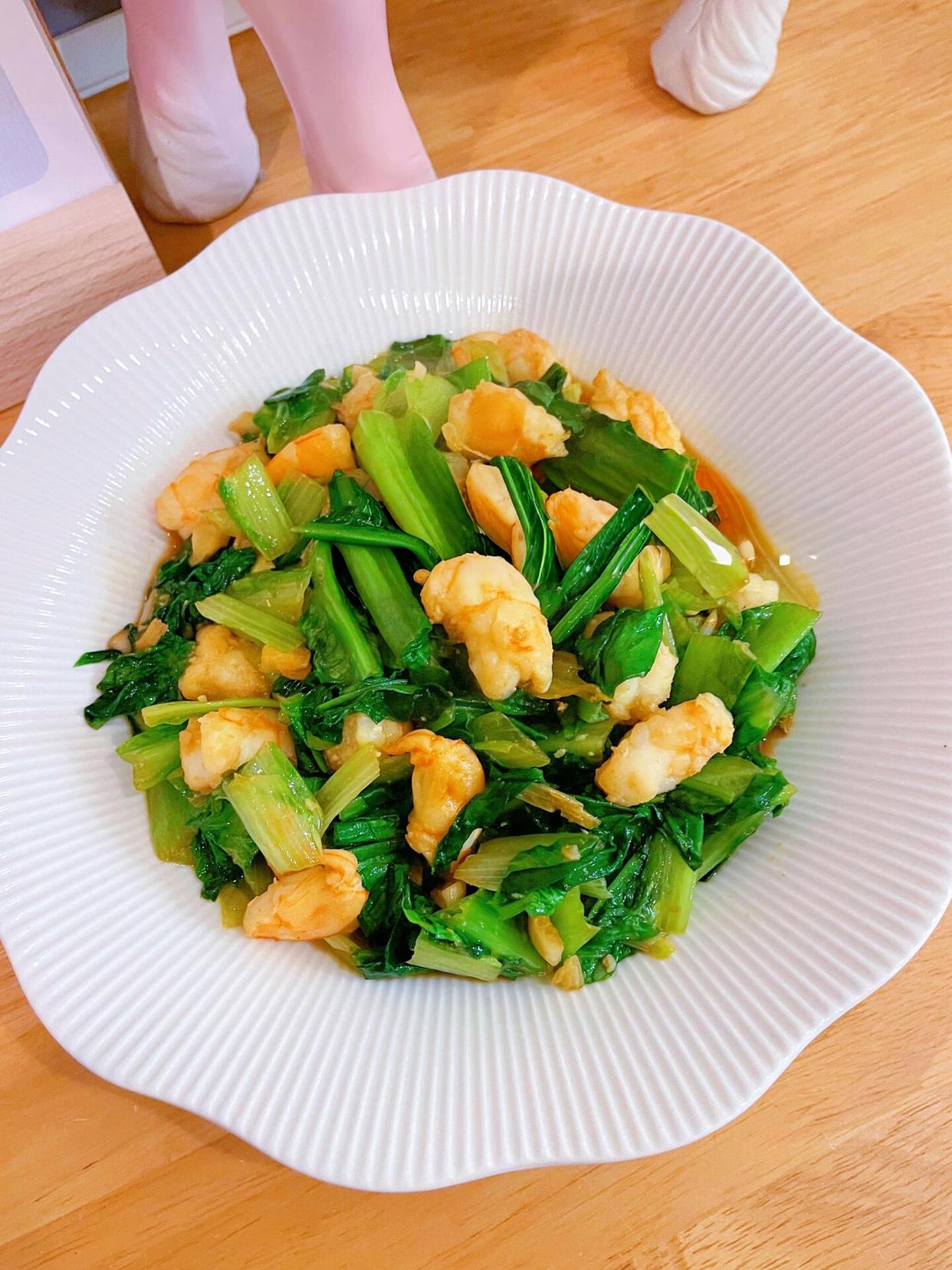 食材:油麥菜1把、蝦仁150克、姜片2片、料酒1勺、鹽少許、白胡椒粉少許