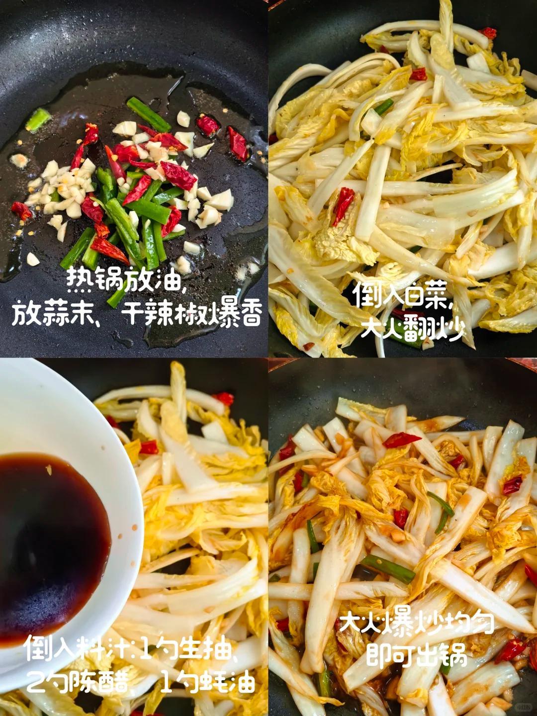 鍋里倒油,油熱后放蒜末、干辣椒炒香,再放入白菜片大火快速翻炒。炒到白菜變軟、邊緣微微發黃時,加兩勺生抽、一勺醋、少許鹽和白糖調味,翻炒均勻后就能出鍋。