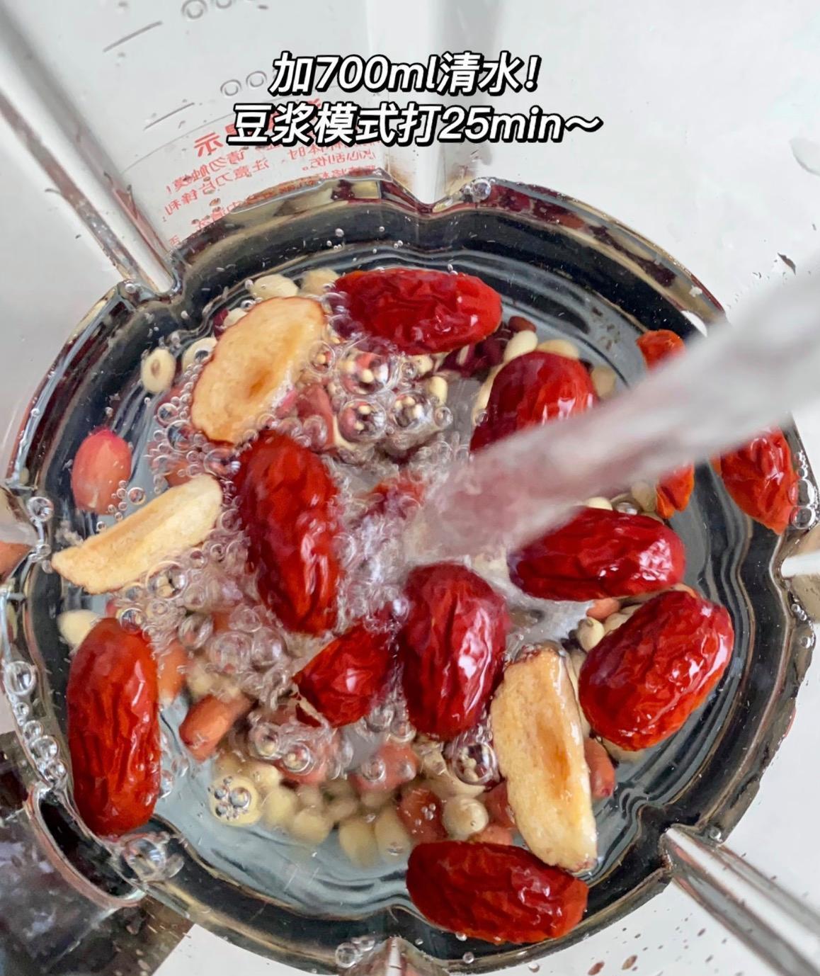 “紅豆花生豆漿”的補血養顏功效更多源于其富含的鐵元素和優質蛋白。 紅豆和紅皮花生都含有一定量的鐵雖然植物性鐵的吸收率不如動物性鐵搭配富含維生素C的食物(如之后可加入兩顆紅棗)可以促進吸收。 更重要的是豆漿本身能提供易于吸收的植物蛋白而蛋白質是合成膠原蛋白的基礎對維持皮膚彈性至關重要。 將30克紅豆、30克黃豆和10克花生搭配是一杯實實在在的“內生性”養顏飲品。