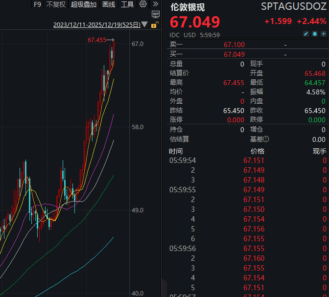 12月20日消息,現貨白銀日內上漲2.44%,突破67美元/盎司,刷新歷史紀錄。