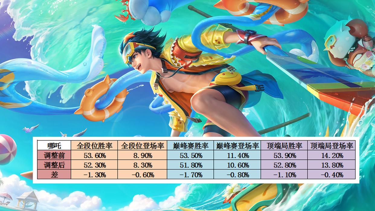 截至目前,哪吒在全段位的勝率降低了1.3%,巔峰賽的勝率降低了1.7%,頂端局的勝率降低了1.1%,這也算是強度下降了一個檔,不過他目前的勝率還算是可以,只能說他現在依舊可以用,但已經算不上是T0梯隊了。