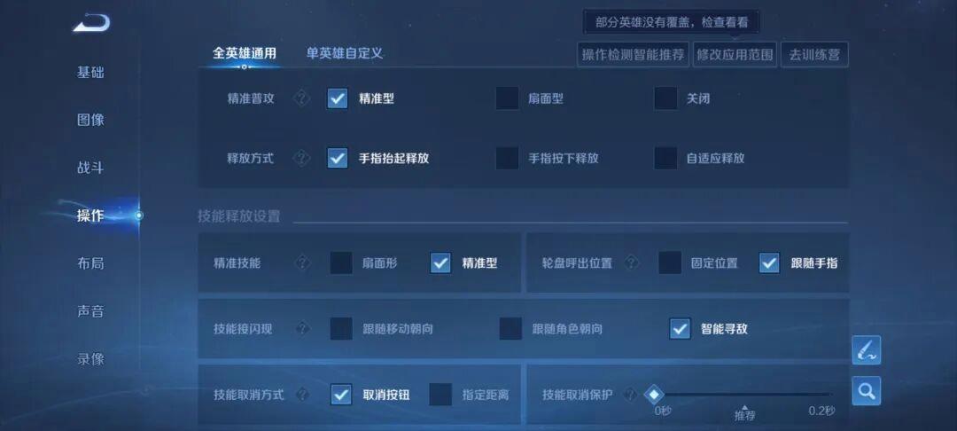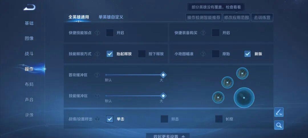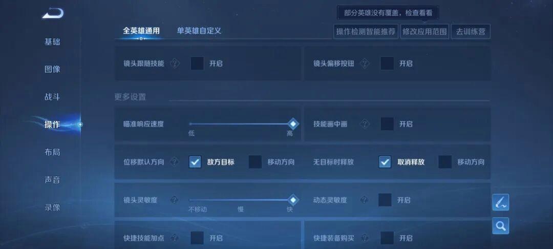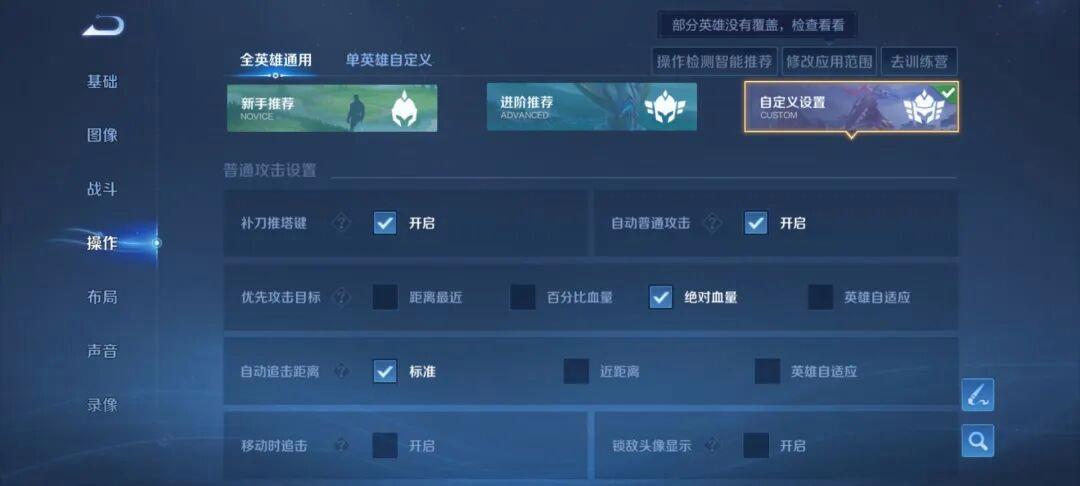 操作設置,小編就不一一講解了,需要注意的是,優先攻擊目標選擇絕對血量,自動攻擊距離近戰選近距離,射手法師選標準。移動時追擊不要開,這個會讓英雄來回抽搐。鎖敵頭像東皇,張良可以開,覺得這個鎖敵頭像有點礙眼就可以關閉。技能接閃現這個推薦大家選擇智能尋敵,像狄仁杰就可以點擊大招接閃現,實現大閃。重點就講講這幾個操作設置,其他的有不懂的,可以在評論區留言討論。