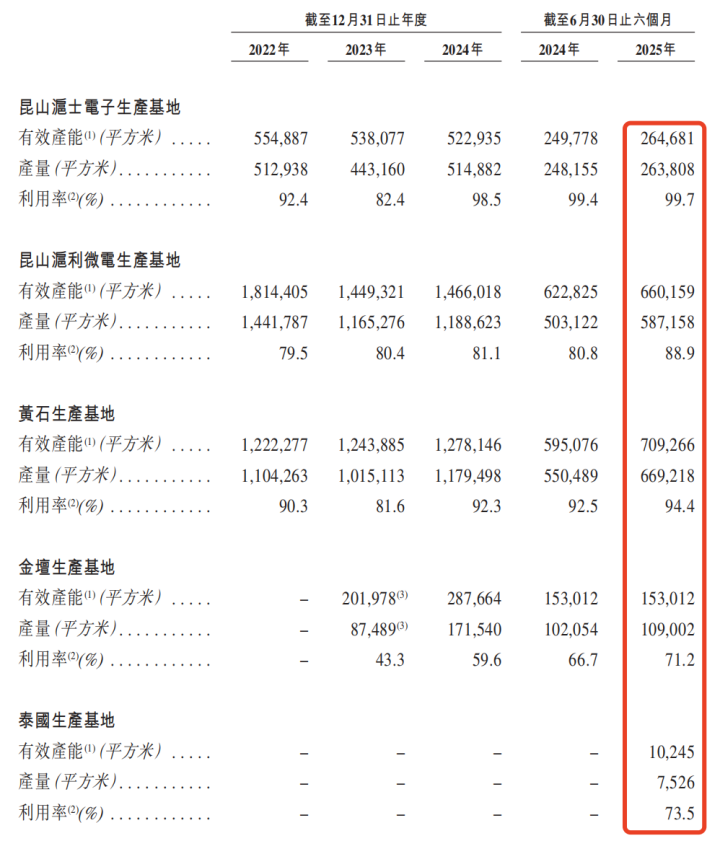 不過,從招股書披露的五大生產基地產能利用率來看,除昆山滬士電子生產基地和黃石基地的產能利用率在2025年上半年基本飽和外,其余生產基地的利用率均不及90%。
